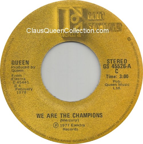 – 1977 – We Are The Champions / We Will Rock You – (Canada GS 45526 – Gold Standard no p/s) LABEL