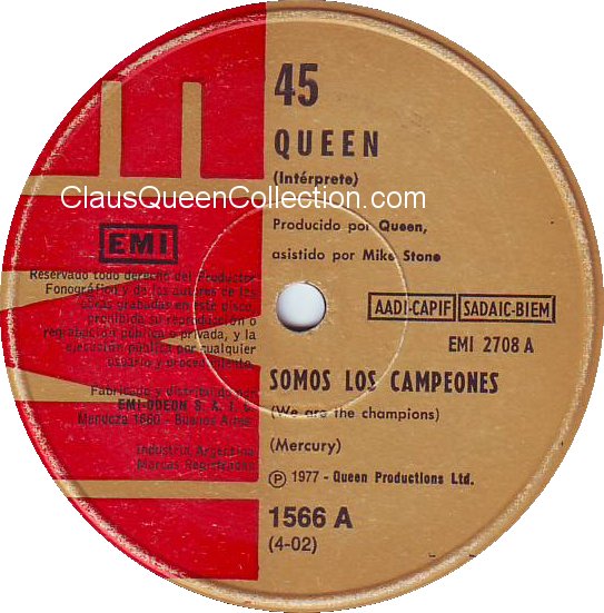 – 1977 – We Are The Champions / We Will Rock You – (Argentina EMI 2708 – no p/s) LABEL