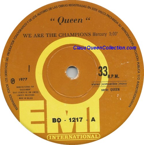 – 1977 – We Are The Champions / We Will Rock You – (Bolivia EMI BO-1217 – no p/s) LABEL