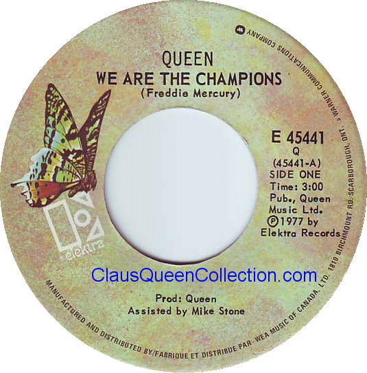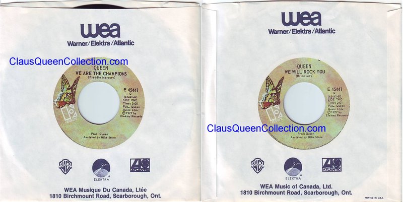 – 1977 – We Are The Champions / We Will Rock You – (Canada E-45441 – no p/s) LABEL