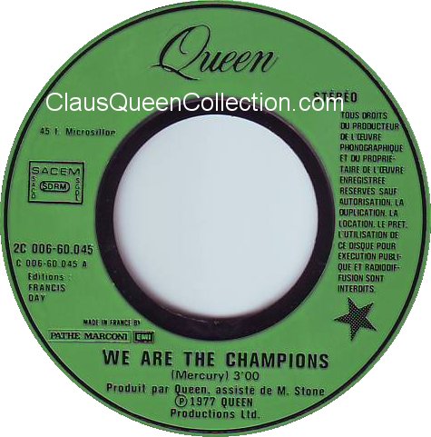– 1977 – We Are The Champions / We Will Rock You – (France EMI 2C 006-60045) LABEL
