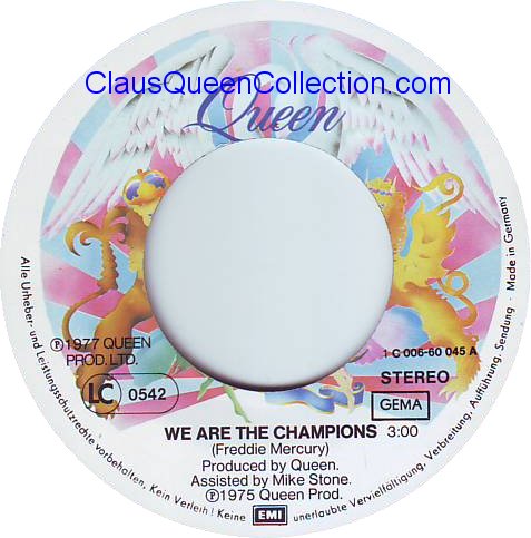 – 1977 – We Are The Champions / We Will Rock You – (Germany EMI 1C 006-60045) LABEL