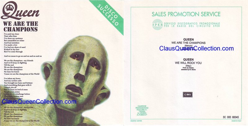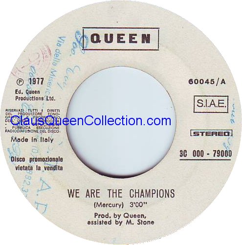 – 1977 – We Are The Champions / We Will R. – (Italy EMI 3C 000-60045 – JB promo Sper sleeve) LABEL