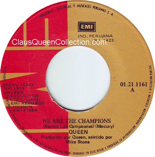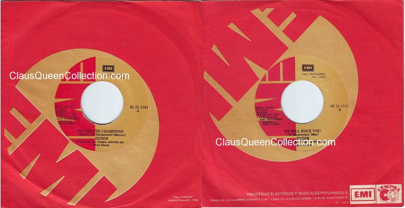– 1977 – We Are The Champions / We Will Rock You – (Perù EMI 01.21.1161 – no p/s) LABEL