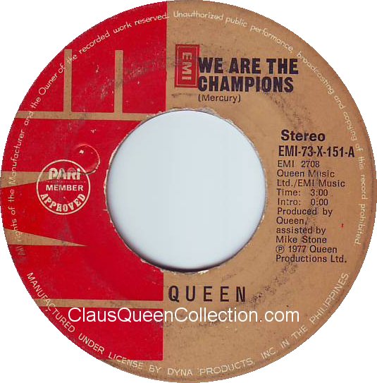 – 1977 – We Are The Champions / We Will Rock You – (Philippines EMI-73-X-151 – no p/s) LABEL