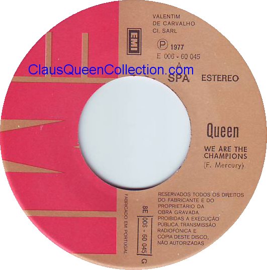 – 1977 – We Are The Champions / We Will Rock You – (Portugal EMI 8E 006-60045) LABEL