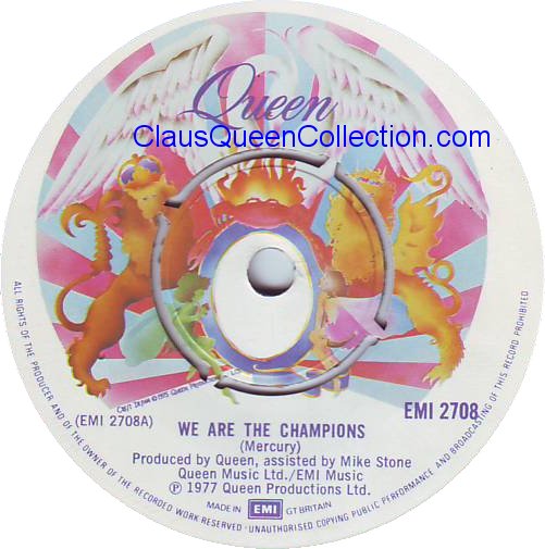 – 1977 – We Are The Champions / We Will Rock You – (UK EMI 2708 ) LABEL