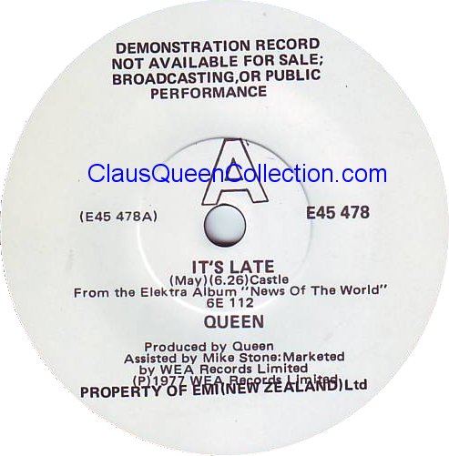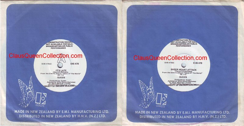 – 1977 – It’s Late / Sheer Heart Attack – (New Zeland E-45478 – demo white label – no p/s) LABEL