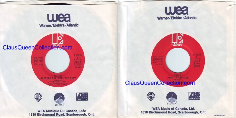 – 1980 – Another One Bites The Dust / Don’t Try Suicide – (Canada E-47031 – promo no p/s) LABEL