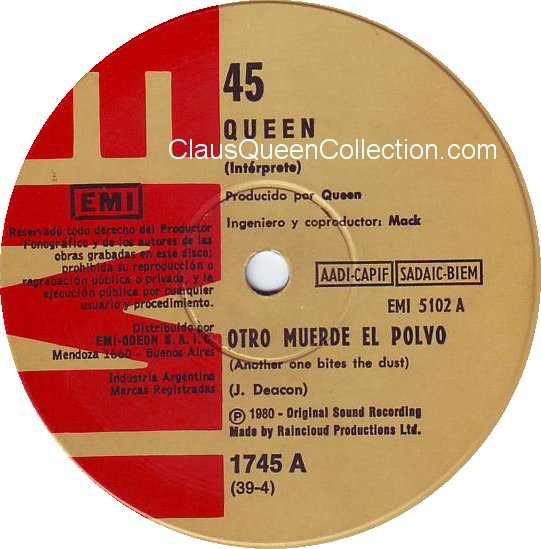 – 1980 – Another One Bites The Dust / Dragon Attack – (Argentina EMI 1745 – no p/s) LABEL