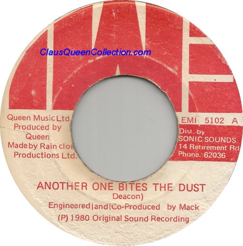 – 1980 – Another One Bites The Dust / Dragon Attack – (Jamaica EMI 5102 – red writes no p/s) LABEL