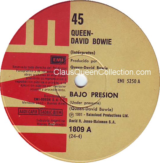 – 1981 – Under Pressure / Soul Brother – (Argentina EMI 1809 – no p/s) LABEL