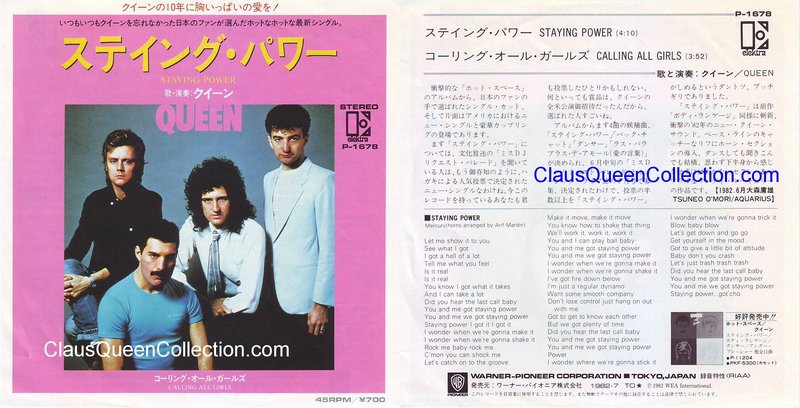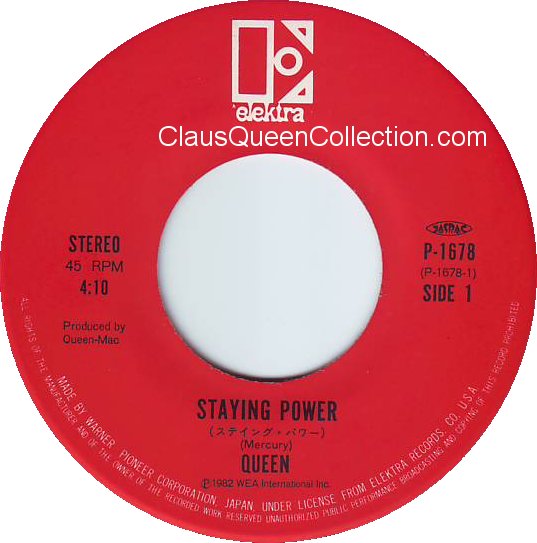 – 1982 – Staying Power / Calling All Girls – (Japan Elektra P-1678 ) LABEL