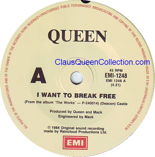 – 1984 – I Want To Break Free / Machines (or back to humans) – (Australia EMI 1248 ) LABEL
