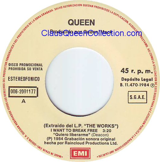 – 1984 – I Want To Break Free / Machines (or back to h.) – (Spain EMI 006-2001177 – promo) LABEL