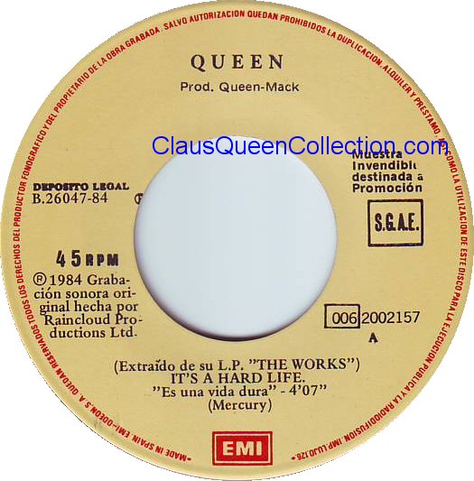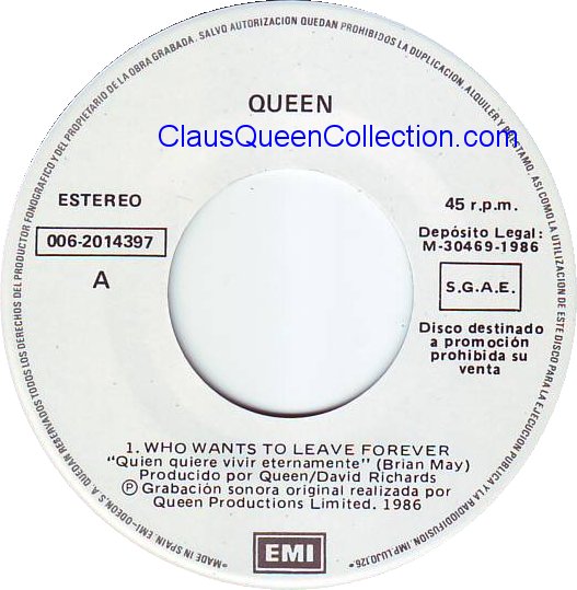 – 1986 – Who Wants To Live Forever / Killer Queen – (Spain EMI 006-2014397 – promo) LABEL