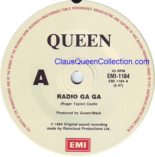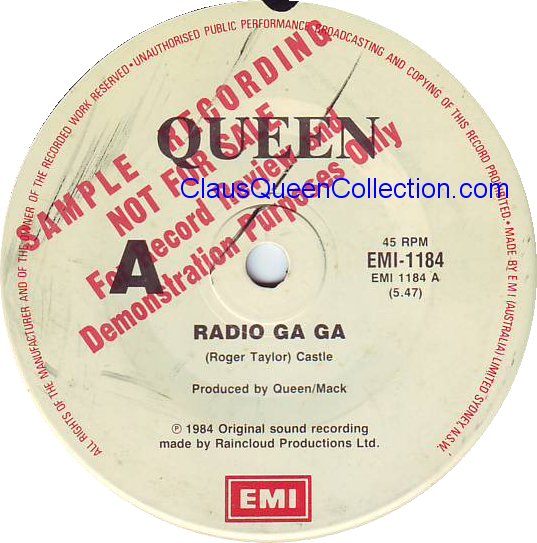 – 1984 – Radio Ga Ga / I Go Crazy – (Australia EMI 1184 – demo not for sale) LABEL