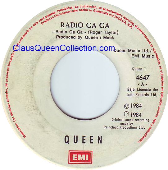 – 1984 – Radio Ga Ga / I Go Crazy – (Guatemala EMI 4647 – no p/s) LABEL