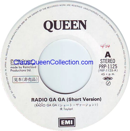 – 1984 – Radio Ga Ga (single v.) / Radio G. (short v.) – (Japan EMI PRP-1125 – promo Xerox p/s) LABEL