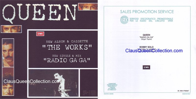 – 1984 – Radio Ga Ga / Ancora Ti Vorrei (B. Solo) – (Italy EMI 3C 000-1792667 – JB Sper sleeve) LABEL