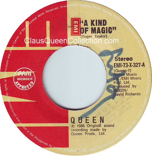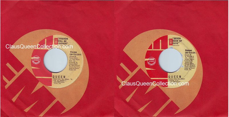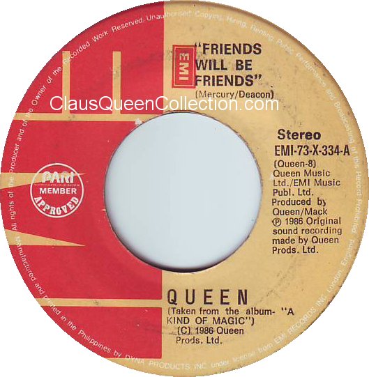 – 1986 – Friends Will Be Friends / Seven Seas Of Rhye – (Philippines EMI 73-X-334 – no p/s) LABEL