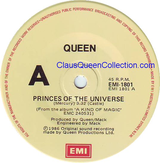 – 1986 – Princes Of The Universe / Gimme The P. – (Australia EMI-1801 – sample not for sale) LABEL
