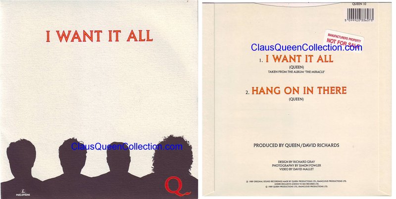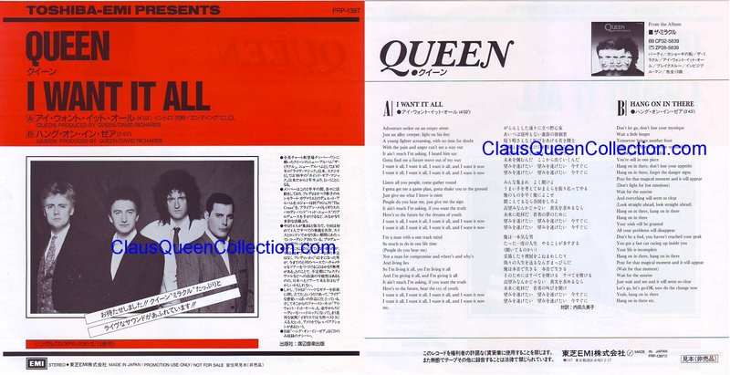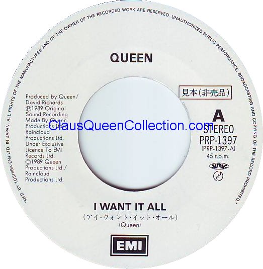 – 1989 – I Want It All / Hang On In There – (Japan EMI PRP-1397 promo only) LABEL FAKE