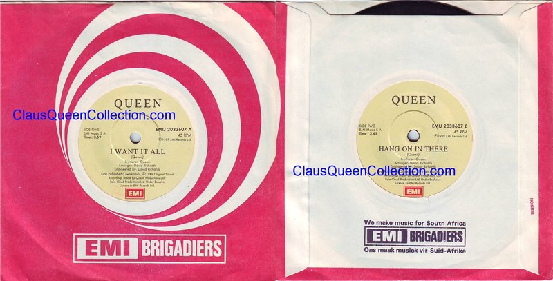 – 1989 – I Want It All / Hang On In There – (South Africa EMIJ 2033607 – no p/s) LABEL