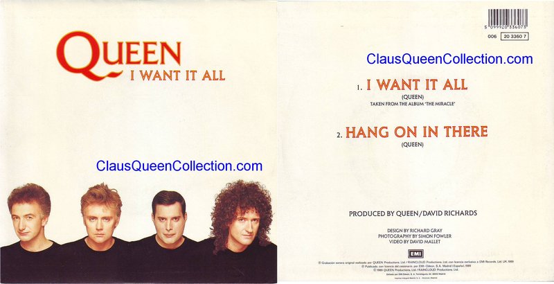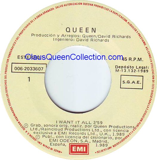 – 1989 – I Want It All / Hang On In There – (Spain EMI 006-2033607) LABEL