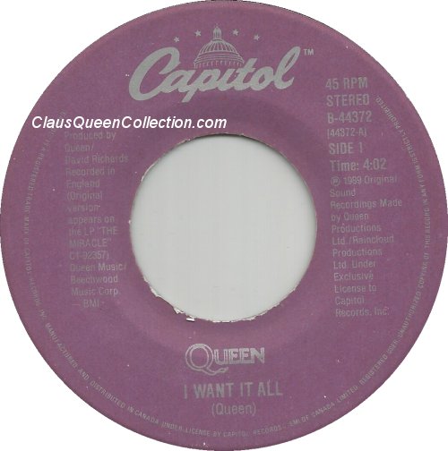 – 1989 – I Want It All / Hang On In There – (USA Capitol B-44372) LABEL