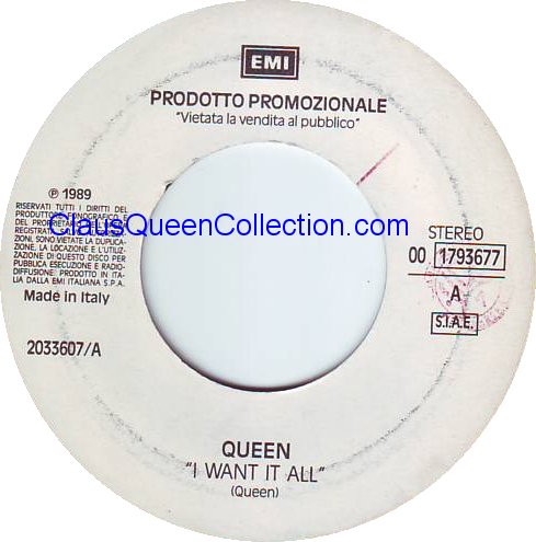 – 1989 – I Want It All / Hang On In There – (Italy EMI 06 2033607) LABEL