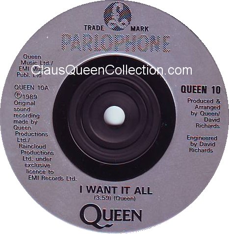 – 1989 – I Want It All / Hang On In There – (UK QUEEN 10) LABEL