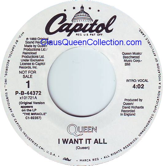 – 1989 – I Want It All / I Want It All – (USA Capitol P-B-44372 – promo no p/s) LABEL