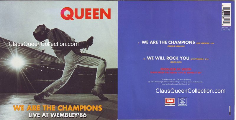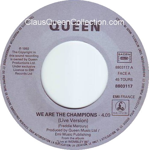 – 1992 – We Are The Champions / We Will Rock You – (live at Wembley) – (France EMI 8803117) LABEL