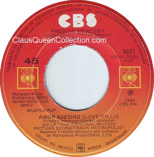 Mexico – 1984 – Love Kills / Rotwang’s Party – (Mexico CBS 45-8621) LABEL