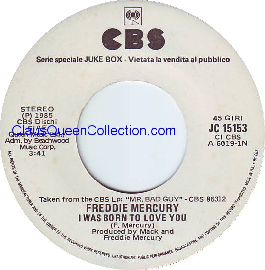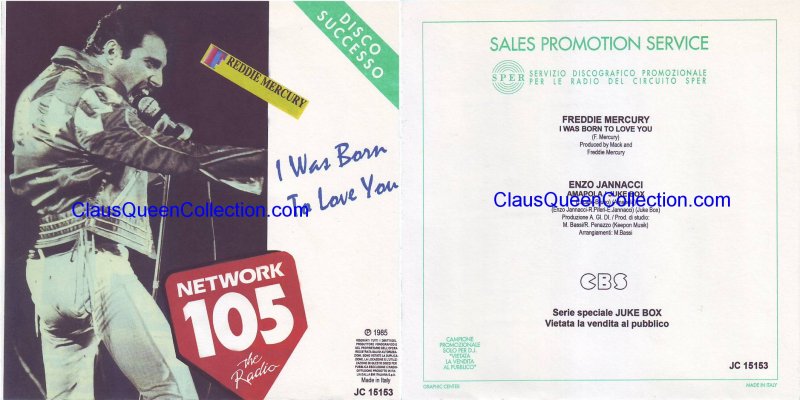 Italy – 1985 – I Was Born To Love You / Amapola (E. Jannacci) – (Italy CBS JC 15153 – JB Sper sleeve) LABEL