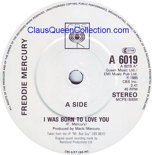 UK – 1985 – I Was Born To Love You / Stop All The Fighting – (UK CBS A 6019) LABEL