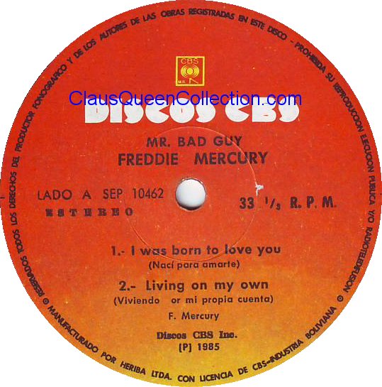 – 1985 – Mr. Bad Guy E.P. – (Bolivia CBS SEP 10462) LABEL