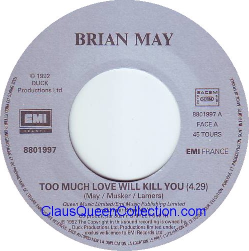 France – 1992 – Too Much Love Will Kill You / I’m Scared – (France EMI 8801997 – unique sleeve) LABEL